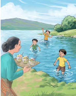 “Uing mah geus ngabayangkeun rek ulin di walungan deukeut sawah Aki,” ceuk Raksa.