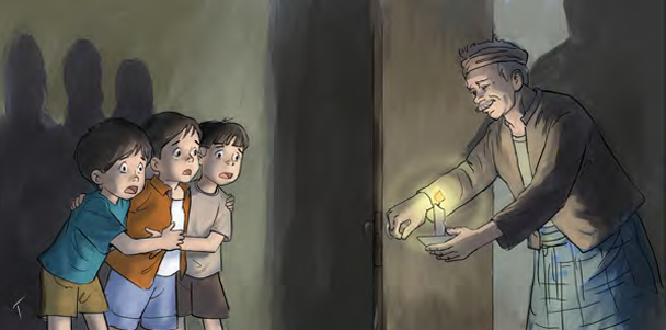 “Kieu, barudak... saperti tadi di kamar. Hidep sarieun sabab teu katingali nanaon,” tembal Aki ngajellaskeun, “tapi pas Aki mawa lilin, hidep bisa nempo deui pan?”