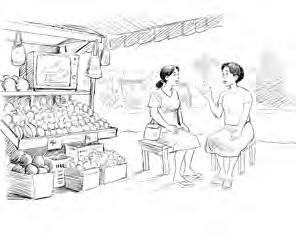 Tari nembalan bari cengkat, “Mangga.... Aeh, geuning Minah. Rek balanja naon atuh Minah teh?”